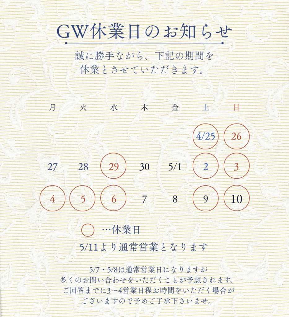 さて、誠に勝手ながらゴールデンウィーク期間中の営業スケジュールを下記の通りとさせていただきます。